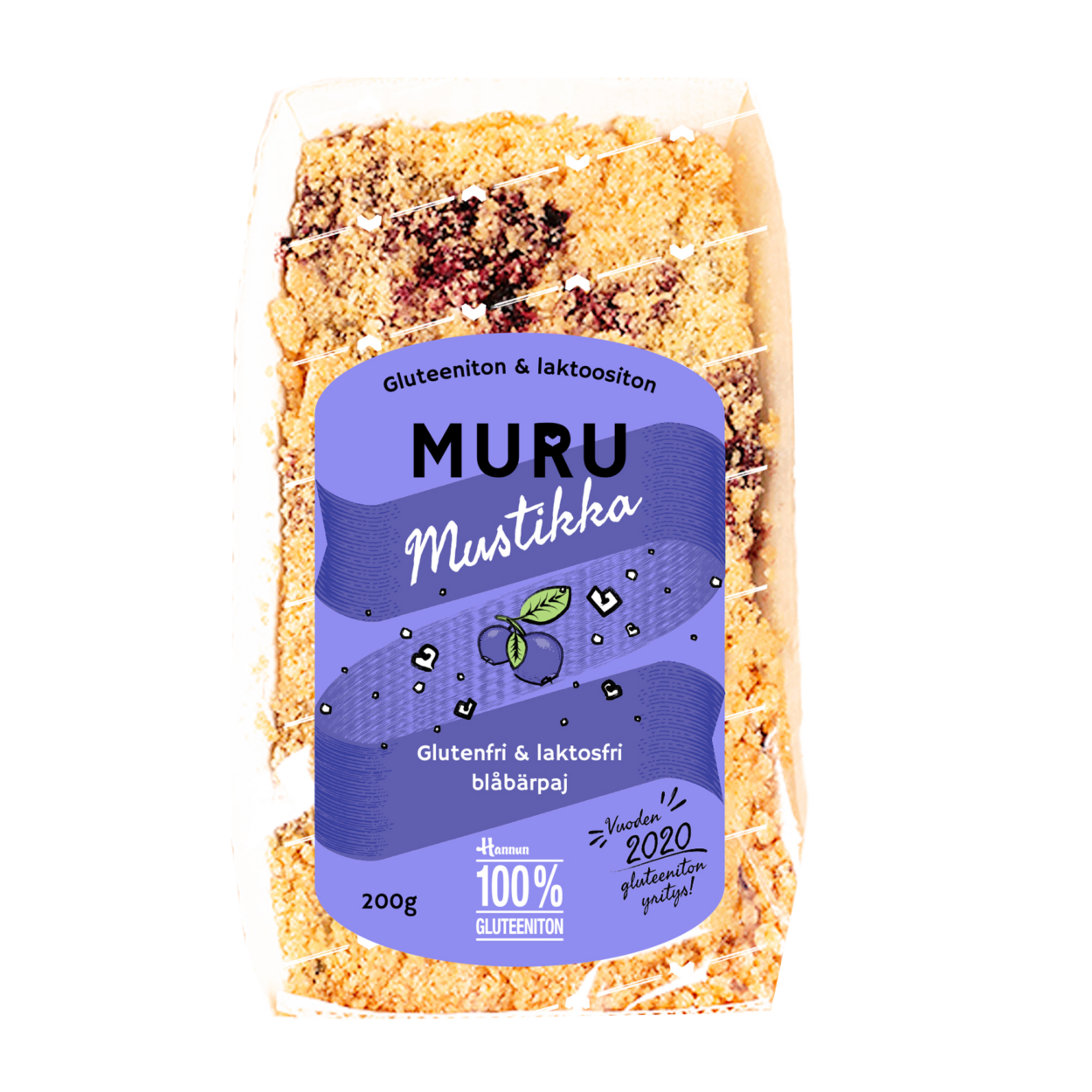 Rahka-jogurttitäyte [jogurtti (35 %), rahka (30 %), sokeri, vesi, muunnettu maissitärkkelys, vaniljauute, aromit (mm. sitruuna), happamuudensäätöaine (E330), väri (E160a), suola, säilöntäaine (E202)], riisijauho, tumma täysjyväriisijauho, maissijauho (GMO-vapaa), perunajauho, psyllium, mustikka (17 %), fariinisokeri, laktoositon voi, sokeri, kananmuna, leivinjauhe (E450), vanilliinisokeri.